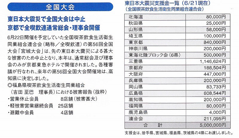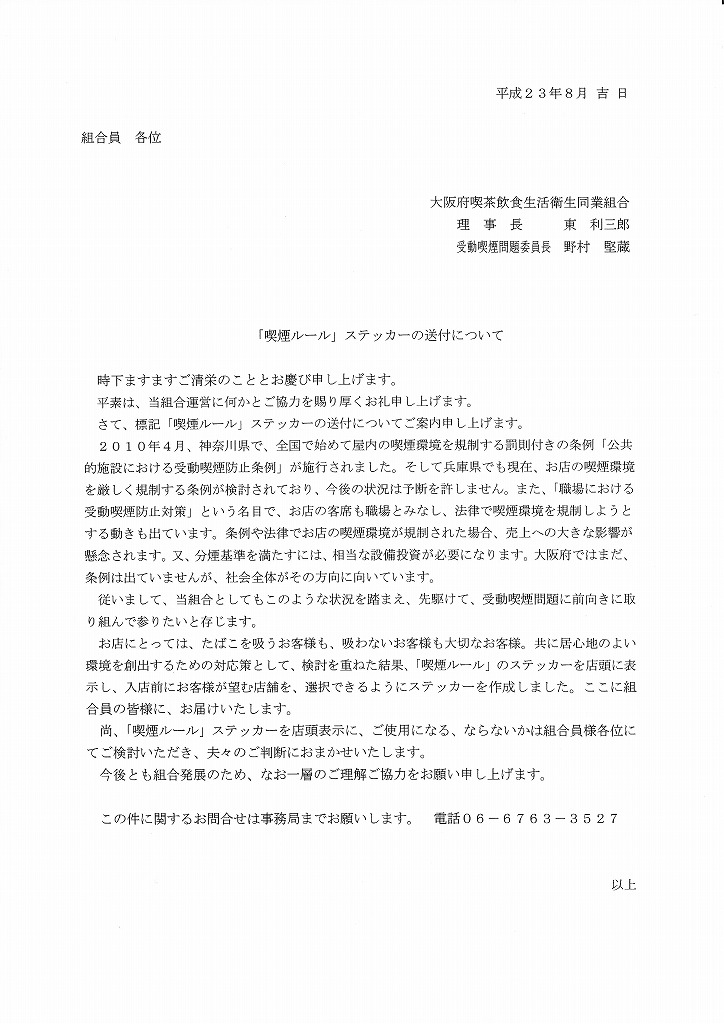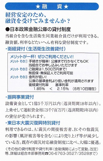 2011年8月 再発行大阪府喫茶飲食生活衛生同業組合入会案内 「喫茶店・飲食店・スナック・カラオケ店等々幅広い同業組合に加入しませんか?」 健康保険料改定額記載・紹介者記入欄付き(PDF) |
