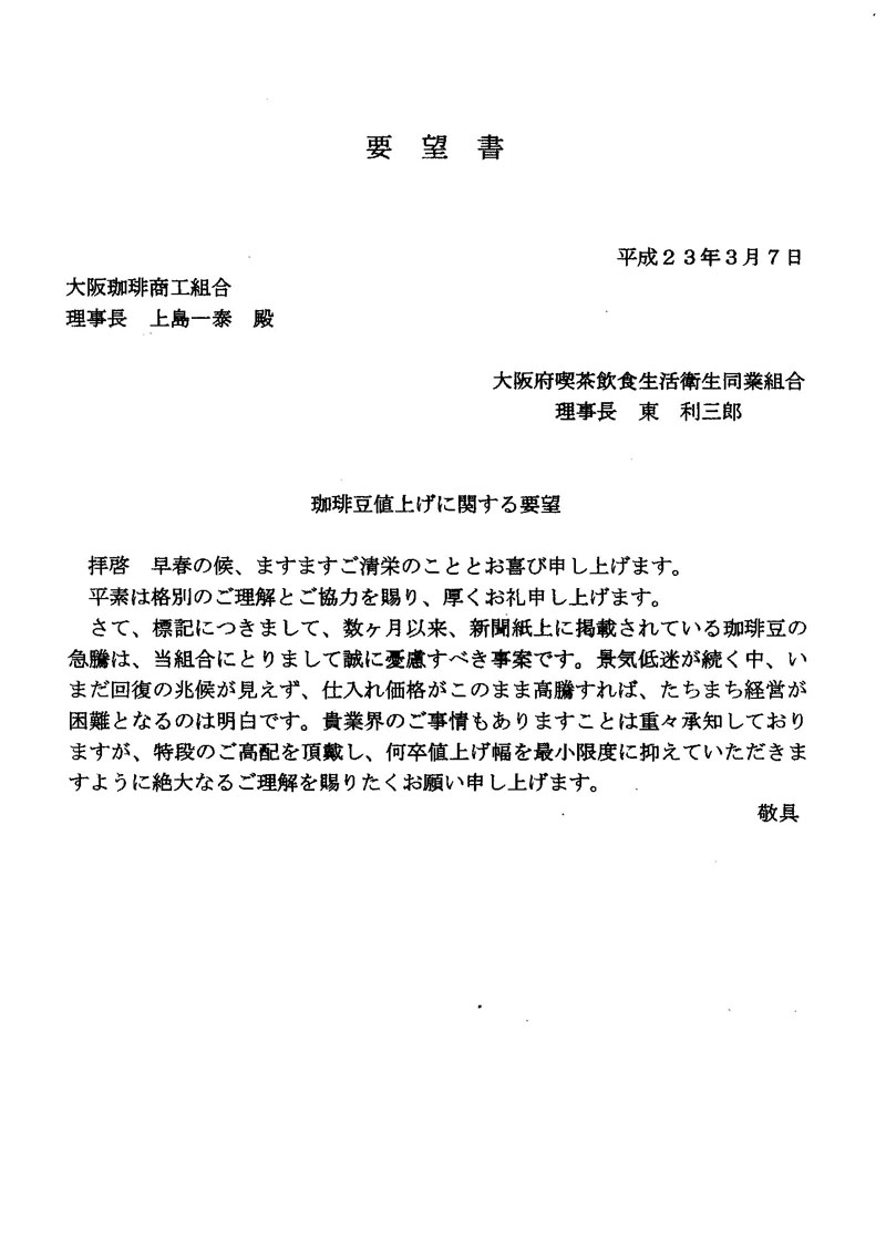 | 2011年3月7日 「珈琲豆値上げに関する要望」を大阪珈琲商工組合に提出 数ヶ月以来、新聞紙上に掲載されています珈琲豆の急騰は、当組合にとりまして まことに憂慮すべき事案です。何卒値上げ幅を最小限度に抑えていただきますよう お願い申し上げます。 |
